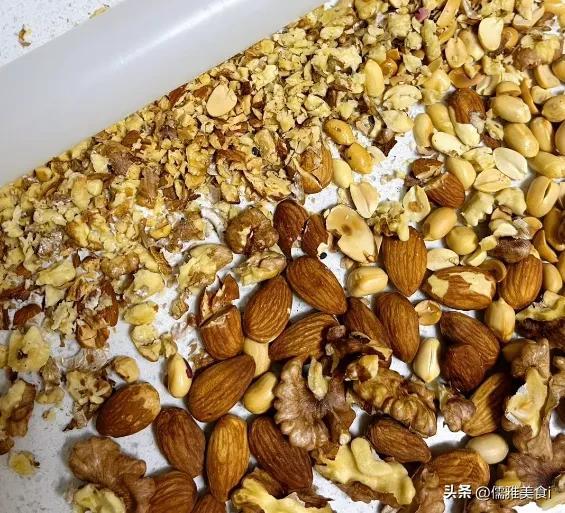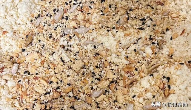 1. 花生炒熟去皮,压成碎末;白芝麻小火炒香备用;