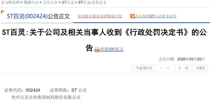 2026年3月28日,贵州百灵(002424)公告知道,公司及关联当事东说念主分手收到贵州证监局的《行政惩处决定书》。上海海汇律所梁讼师辅导:因未线路功绩预报投资者索赔已终审胜诉。2024年1月31日(含)至2024年4月29日(含)期间买入该股;或2020年4月30日(含)至2024年4月29日(含)期间买入该股,且在2024年4月29日闭市后当日仍执有的受损投资者可在公义之星网(gyzx365.com)央求索赔挽损。