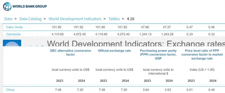 这个不是我纯粹说的,下图来自世界银行官网,东谈主民币兑换好意思元的PPP(购买力平价)汇率,2024年是1好意思元=3.53元东谈主民币,2023年是3.64元东谈主民币,而好意思元兑换东谈主民币汇率2023年和2024年区分是7.08和7.2,