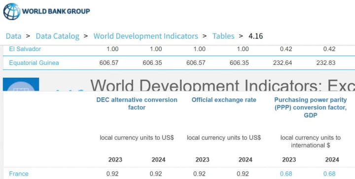 再看了下法国的欧元PPP汇率,欧元兑换好意思元官方汇率是0.92欧元=1好意思元,2023年和2024年用PPP汇率酿成 0.68欧元=1好意思元。