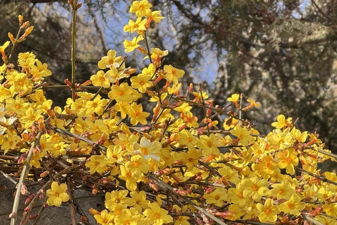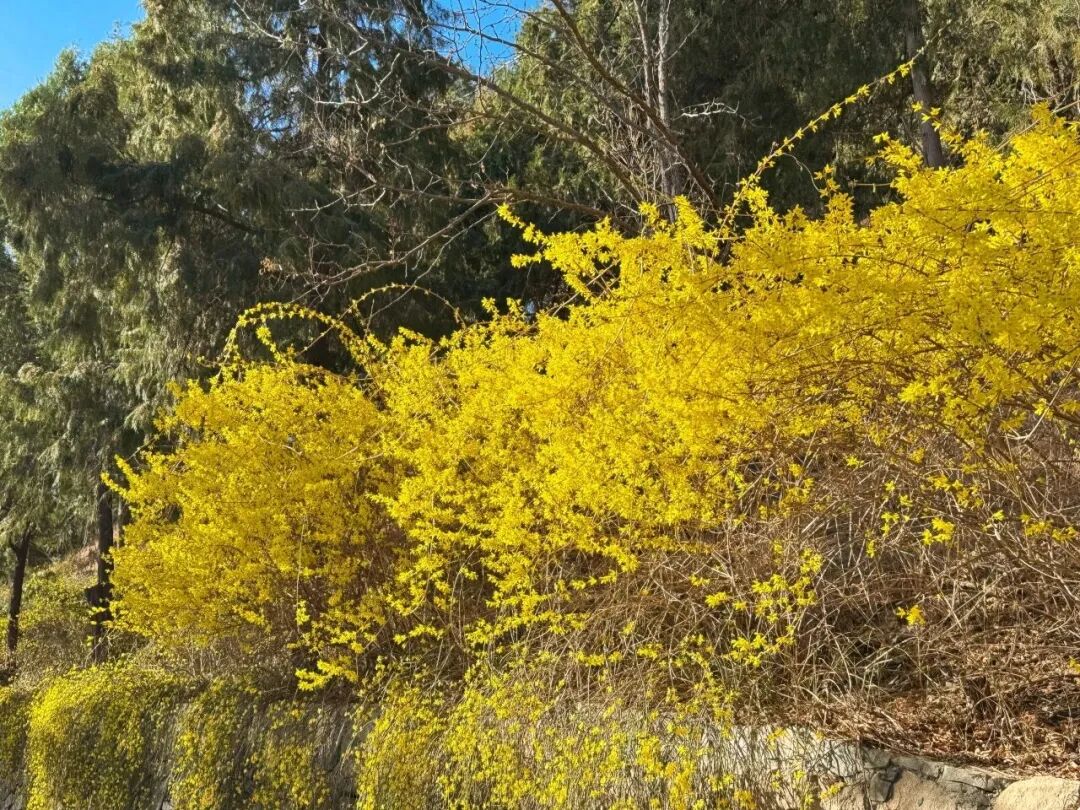 百望平地处北京市海淀区,属太行山余脉,是太行山延长到华北平原最东端的山脊。投入春天,百望山上各式花草争相灵通,好意思不堪收。公园的路边谈旁迎春花灵通,一簇簇、一丛丛金黄的花瓣缀满藤,搭配纤细的枝条随风摇曳,像一群灵动的小精灵。