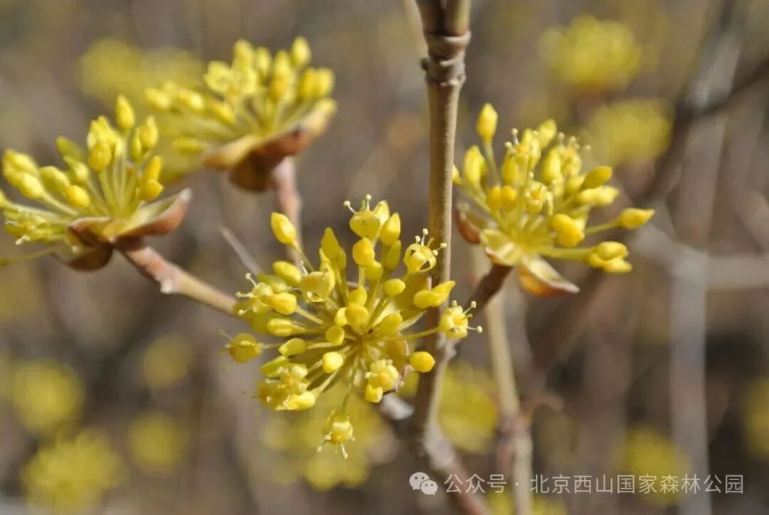 北京西山国度丛林公园位于北京西郊小西山,属太行山余脉。鬼笑石位于西山白塔山上,海拔473米,与香山香炉峰遥呼相应,是俯瞰北京城的绝佳位置。春天到来,北京西山国度丛林公园里的山茱萸正在蓄力准备灵通。“朱实山下开,幽香寒更发”,山茱萸最特地的就是先花后叶,早春当先开出金黄好意思丽的小花,伞形头状花序密密麻麻缀满枝条,在北京3月中旬就会迎来盛花期,花期足足30多天。满枝金黄如同薄雾隐蔽,远远看去一派虚心金光,调治感拉满。