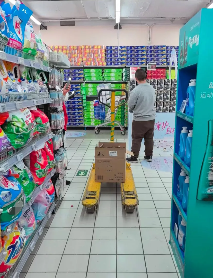 2月27日早上8点多,记者一进超市便听到货车车轮碾轧地板的霹雷声,以及碾过地砖间隙的咯噔声。记者不雅察发现,该家超市的大地铺设材料不一,主要通说念是间隙较小的大块地板砖,而货架之间的大地则由一块块小方砖铺成,这些小方砖间拼缝较宽较深,坚贞的车轮一碾过就会发出较大的声响。记者的背后传来一阵霹雷声,回头看见别称职工正拉着几箱饮猜想货架前补货。