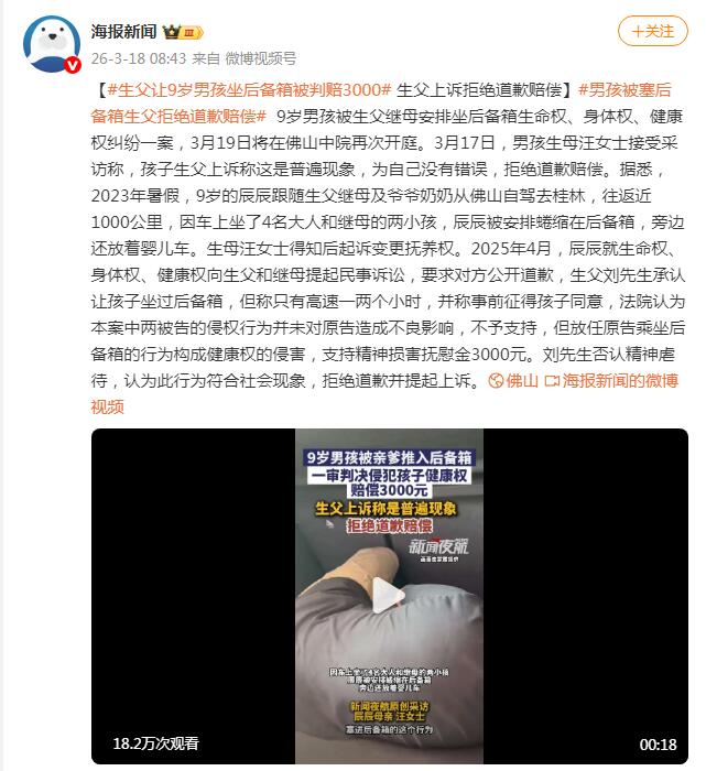 9岁男孩被生父继母安排坐后备箱人命权、躯壳权、健康权纠纷一案,3月19日将在佛山中院再次开庭。3月17日,男孩生母汪女士秉承采访称,孩子生父上诉称这是多半欢喜,为我方莫得弱点,拆开说念歉抵偿。据悉,2023年暑假,9岁的辰辰随从生父继母及爷爷奶奶从佛山自驾去桂林,来去近1000公里,因车上坐了4名大东说念主和继母的两小孩,辰辰被安排瑟索在后备箱,开云体育傍边还放着婴儿车。生母汪女士得知后告状变更赡养权。2025年4月,辰辰就人命权、躯壳权、健康权向生父和继母拿起民事诉讼,条目对方公开说念歉,生父刘先生承认让孩子坐事后备箱,但称只须高速一两个小时,并称事先征得孩子喜悦,法院合计本案中两被告的侵权活动并未对原告变成不良影响,不予撑捏,但放任原告乘坐后备箱的活动组成健康权的侵害,撑捏精神毁伤安危金3000元。刘先生否定精神暴戾,合计此活动适宜社会欢喜,拆开说念歉并拿起上诉