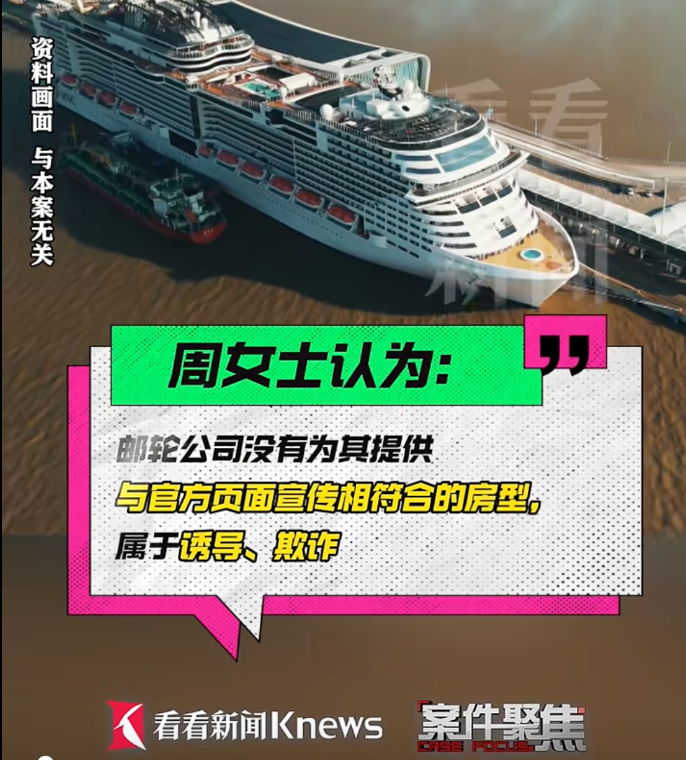 返程后,周女士越念念越胸闷,将该邮轮公司及某在线旅行就业平台诉至东说念主民法院,条目全额退还邮轮旅游居品就业费,并补偿三倍就业费。