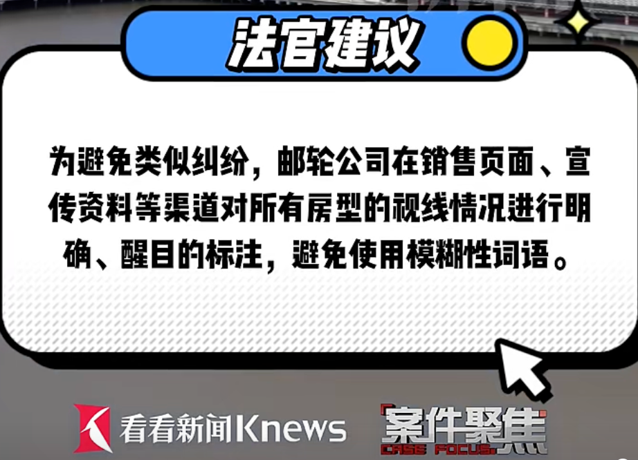 邮轮公司则辩称:其在官方页面宣传涉案“精选阳台房”领有更开阔的天外视线及更大面积阳台,并未将其界说为无庇荫房型,同期页面也标注了“以船上实质提供为准”。周女士算作具有辩别才略的消耗者,登船后以为舱房不稳妥预期,却未实时提议更换,应自行承担相应恶果,其在向周女士提供邮轮居品和就业历程中不存在走嘴和讹诈行动。