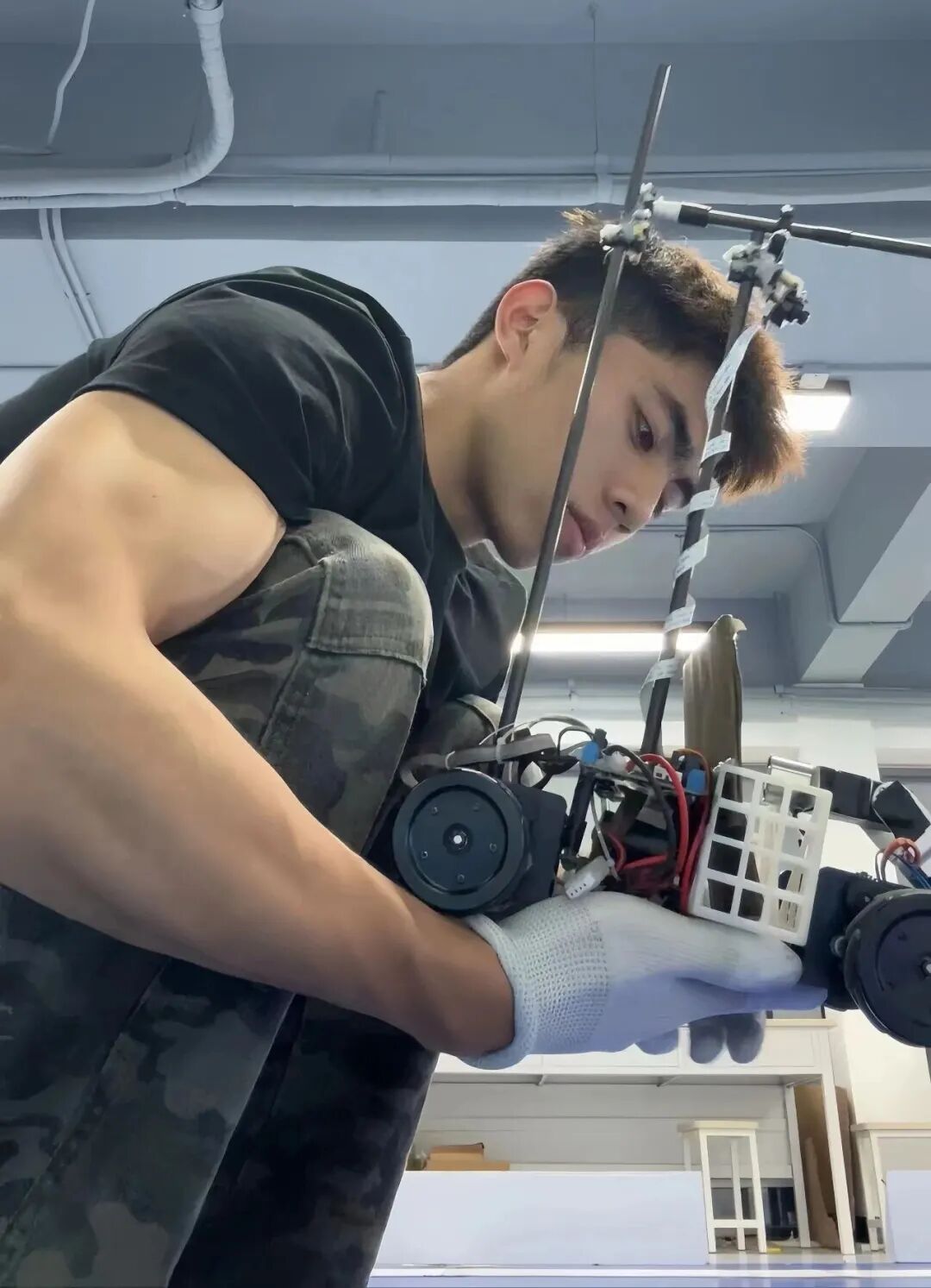 最近,浙江工商大学信息与电子工程学院的王一扬同学有烽火,作为行将毕业的优秀学生,学校对他进行了采访,没猜测晒出的一张相片未必收货了许多读者点赞。相片里,他正在接头调试一辆机器东谈主小车,胳背上肌肉量爆表。