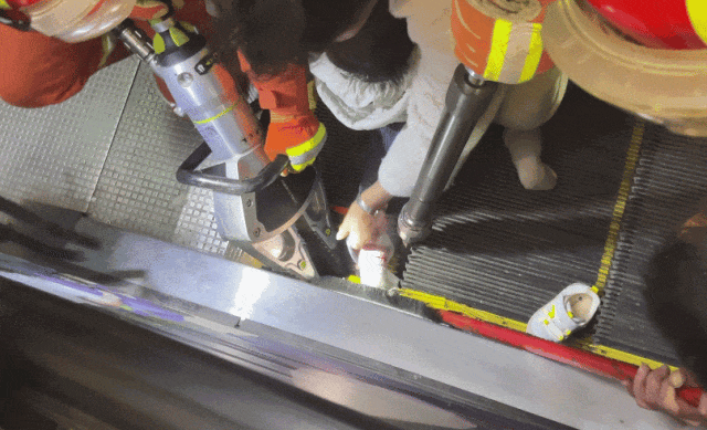 消防员当场对扶梯进行破拆