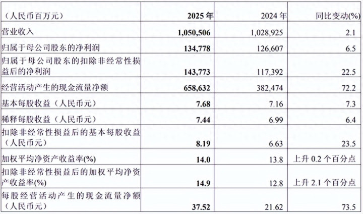 2026年3月26日,中国祯祥(601318,02318)选藏表露2025年全年功绩。财报数据表露,中国祯祥2025年总营收为10505.06亿元;包摄于母公司股东的营运利润1344.15亿元,同比增长10.3%;包摄于母公司股东的扣非净利润1437.73亿元,同比增长22.5%;归母净利润为 1347.78亿元。