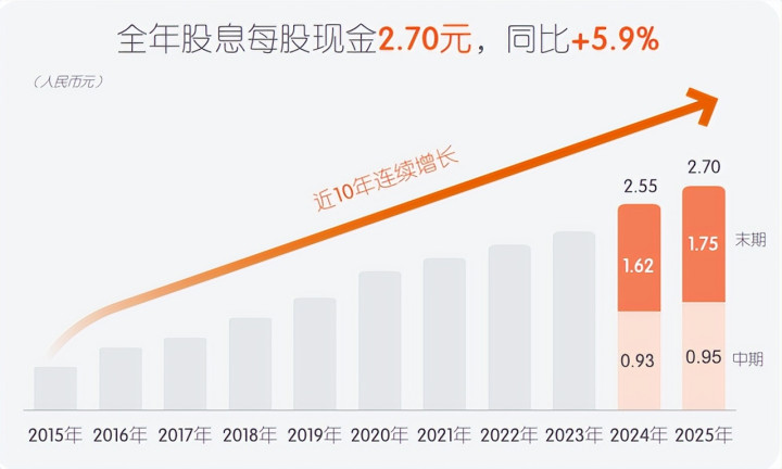 中国祯祥也用本体行为,解说了与投资者价值共创的理念。凭据利润分拨决策,公司拟派发2025年末期股息每股现款东谈主民币1.75元(含税),重叠已派发的中期股息,全年股息达到每股现款东谈主民币2.70元(含税),同比增长5.9%,全年现款分成总数高达488.91亿元。